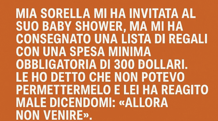 Mi aveva invitata alla sua festa, ma insieme all’invito mi aveva consegnato un registro dei regali con una spesa minima obbligatoria di 300 dollari. Le dissi che non potevo permettermelo e lei, seccata, mi rispose: «Allora non venire». Decisi comunque di inviarle un piccolo pacchetto.