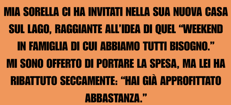 Mia sorella ci aveva invitati nella sua nuova casa sul lago, entusiasta all’idea di quel “weekend in famiglia di cui abbiamo tutti bisogno.”