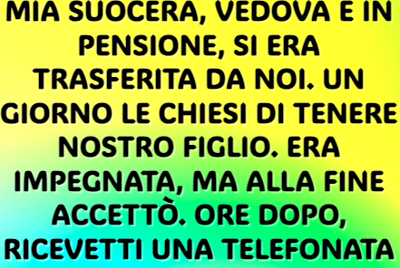 Mia suocera, vedova e in pensione, si era trasferita da noi. Un giorno le chiesi di tenere nostro figlio. Era impegnata, ma alla fine accettò. Ore dopo, ricevetti una telefonata che mi fece gelare il sangue: mio figlio, con voce tremante, disse: