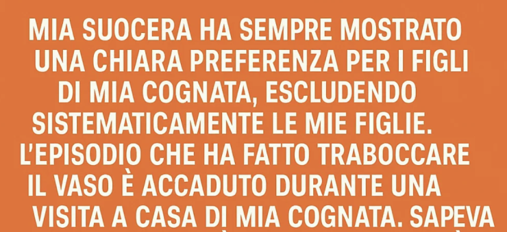 Mia suocera ha sempre mostrato una chiara preferenza per i figli di mia cognata, lasciando sistematicamente da parte le mie figlie. L’episodio che ha fatto traboccare il vaso è accaduto un pomeriggio a casa di mia cognata. Lei sapeva che eravamo lì anche noi, ma si è presentata con regali solo per i figli di mia cognata, ignorando completamente le mie bambine. In quel momento ho pensato: “Vedrai,” e ho iniziato a pianificare qualcosa.