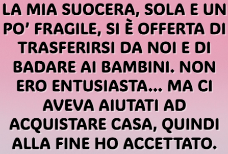 La mia suocera, sola e un po’ fragile, si è offerta di trasferirsi da noi e di badare ai bambini. Non ero entusiasta… ma ci aveva aiutati ad acquistare casa, quindi alla fine ho accettato.