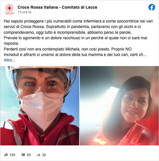 Il comitato della Croce Rossa Italiana di Lecce ha voluto ricordarla con un messaggio commovente pubblicato sui social: “Hai saputo proteggere i più vulnerabili come infermiera e come soccorritrice nei vari servizi di Croce Rossa. Soprattutto in pandemia, parlavamo con gli occhi e ci comprendevamo, oggi tutto è incomprensibile, abbiamo perso le parole. Prevale lo sgomento e un dolore racchiuso in un perché al quale non ci sarà mai risposta. Perderti così non era contemplato Michela, non così presto. Proprio NO. Increduli e affranti ci uniamo al dolore della tua mamma e dei tuoi cari, certi che il tuo passaggio su questa terra e in questa vita resterà per sempre nei ricordi di chi ti ha conosciuta e ti ha voluto bene. A Dio Michela”.