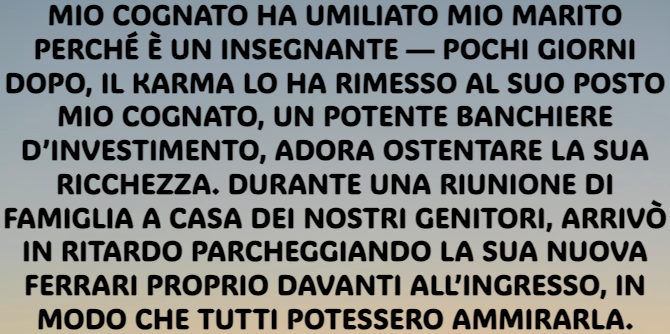 Mio cognato, un potente banchiere d’investimento, adora ostentare la sua ricchezza. Durante una riunione di famiglia a casa dei nostri genitori, arrivò in ritardo parcheggiando la sua nuova Ferrari proprio davanti all’ingresso, in modo che tutti potessero ammirarla.