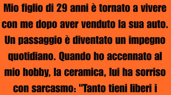 Mio figlio, 29 anni, è tornato a casa dopo aver venduto la sua auto. Un passaggio ogni tanto si è trasformato in un impegno quotidiano. Quando ho nominato il mio hobby, la ceramica, ha sorriso con sarcasmo: “Tanto tieni i pomeriggi liberi per accompagnarmi in giro.” Ho sorriso anch’io, ma dentro ribollivo. Appena ha chiuso la porta, in silenzio mi sono iscritta a un laboratorio avanzato di ceramica. Si teneva ogni pomeriggio: proprio quando lui pensava che fossi libera.