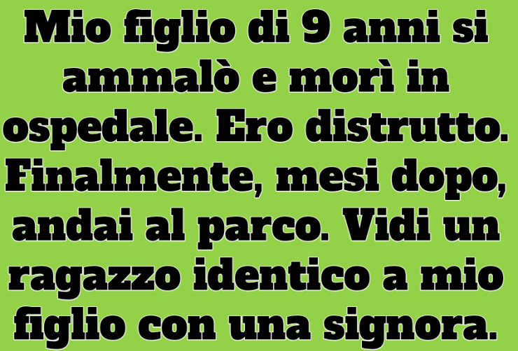 Mio figlio di nove anni si ammalò e morì in ospedale. Ero un relitto. Finalmente, mesi dopo, andai al parco. Vidi un ragazzo identico a mio figlio con una signora. Sparirono in fretta. Pensai di averlo solo immaginato. Sette anni dopo, l’infermiera del suo ospedale mi trovò. Venne a dirmelo…