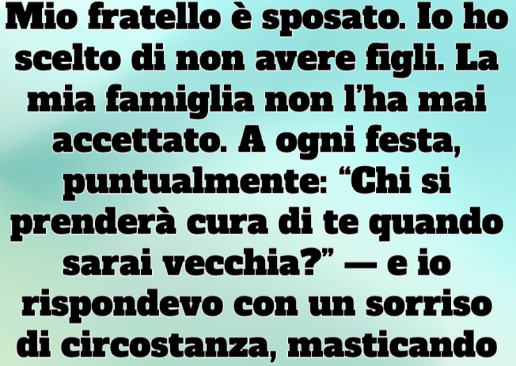 fratello è sposato. Io ho scelto di non avere figli. La mia famiglia non l’ha mai accettato. A ogni festa, puntualmente: “Chi si prenderà cura di te quando sarai vecchia?” — e io rispondevo con un sorriso di circostanza, masticando il senso di colpa stagionale servito con il tacchino. Pensavo che, se avessi ignorato le domande abbastanza a lungo, magari avrebbero smesso. Ma non l’hanno mai fatto.
