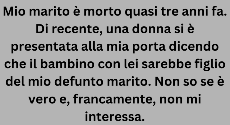 Di recente, una donna si è presentata alla mia porta dicendo che il bambino con lei era figlio del mio defunto marito. Non so se sia vero e, francamente, non mi interessa.
