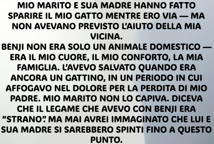 Mi voltai verso mia suocera, seduta al tavolo con un sorrisetto. «Dov’è il mio gatto?»