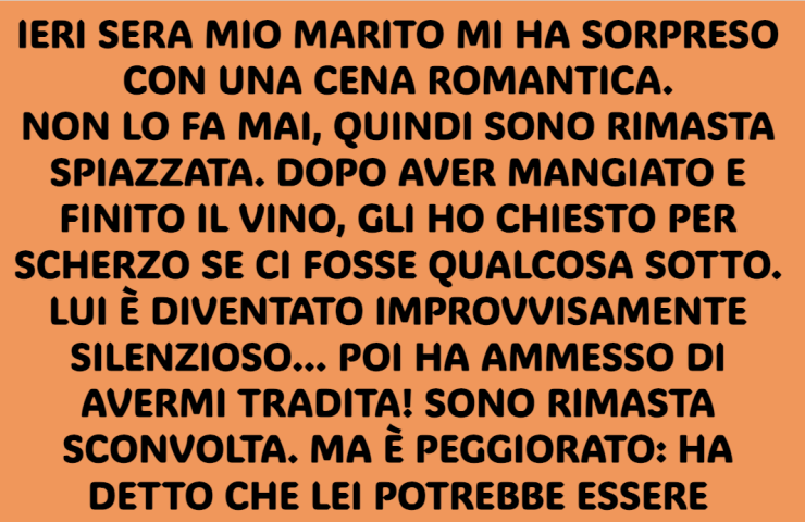 Non lo fa mai, quindi sono rimasta spiazzata. Dopo aver cenato e finito il vino, gli ho chiesto per scherzo se ci fosse qualcosa che non andava. È rimasto in silenzio… poi ha ammesso di avermi TRADITA. Ero sconvolta. Ma è andata ancora peggio: ha detto che lei poteva essere INCINTA.
