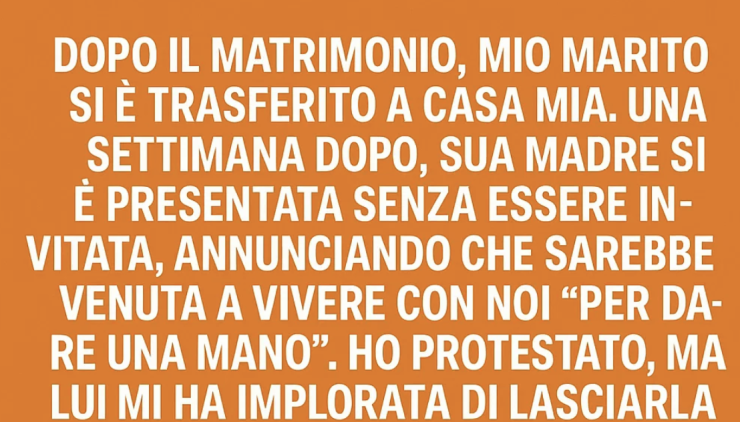 Dopo il matrimonio, mio marito si è trasferito a casa mia. Una settimana dopo, sua madre si è presentata senza preavviso, dicendo che sarebbe venuta a vivere con noi “per aiutare”. Ho protestato, ma lui mi ha supplicata di lasciarla restare: