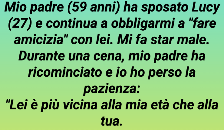 Mio padre (59 anni) ha sposato Lucy (27) e continua a obbligarmi a “fare amicizia” con lei. Mi fa star male. Durante una cena, mio padre ha ricominciato, e io ho perso la pazienza:
