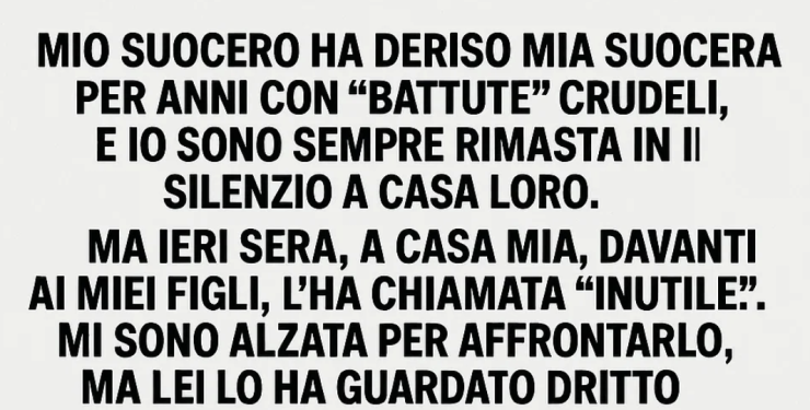 Mio suocero ha preso in giro mia suocera per anni con “battute” crudeli, e io sono sempre rimasta zitta a casa loro. Ma ieri sera, a casa mia, davanti ai miei figli, l’ha chiamata “inutile”. Mi sono alzata per affrontarlo, ma lei lo ha guardato dritto negli occhi e ha detto: