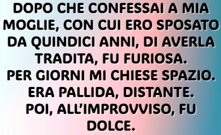 Dopo che confessai a mia moglie, con cui ero sposato da quindici anni, di averla tradita, fu furiosa. Per giorni mi chiese spazio. Era pallida, distante.
