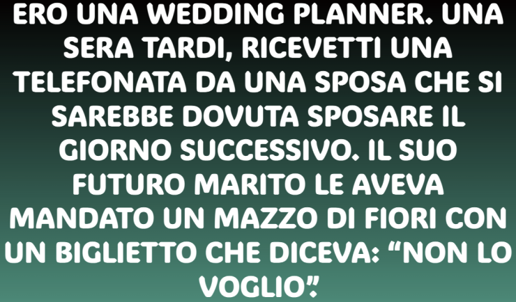 Facevo la wedding planner. Una sera tardi ricevetti una telefonata da una sposa, il cui matrimonio era previsto per il giorno successivo. Il futuro marito le aveva mandato un mazzo di fiori. Il biglietto diceva: “Non lo voglio”.