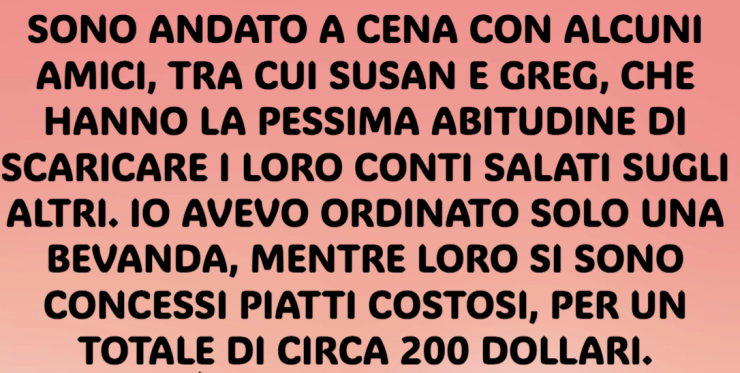 Ero andata a cena con alcuni amici, tra cui Susan e Greg, che hanno la pessima abitudine di scaricare i loro conti salati sugli altri. Io avevo ordinato solo una bevanda, mentre loro si erano concessi piatti costosi, per circa 200 dollari.