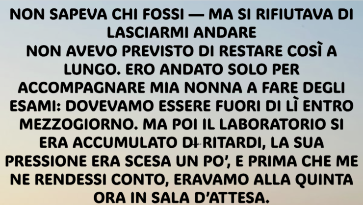 Non avevo previsto di restare così a lungo. Ero andato solo per accompagnare mia nonna a fare degli esami: dovevamo essere fuori di lì entro mezzogiorno. Ma poi il laboratorio si era accumulato di ritardi, la sua pressione era scesa un po’, e prima che me ne rendessi conto, eravamo alla quinta ora in sala d’attesa.