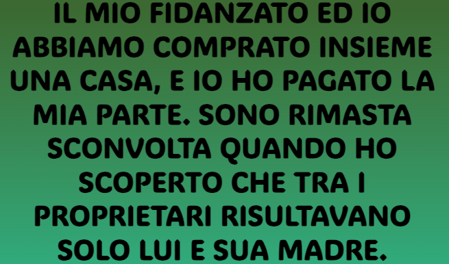 Il mio fidanzato ed io abbiamo comprato insieme una casa, e io ho pagato la mia parte. Sono rimasta sconvolta quando ho scoperto che tra i proprietari risultavano solo lui e sua madre. Quando l’ho affrontato, mi ha risposto: «Tesoro, non sei ancora parte della famiglia, non sei nemmeno mia moglie.»