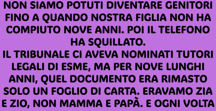 Il tribunale ci aveva nominati tutori legali di Esme, ma per nove lunghi anni, quel documento era rimasto solo un foglio di carta. Eravamo zia e zio, non mamma e papà. E ogni volta che il telefono squillava e si sentiva la voce della madre biologica, Esme correva a nascondersi dietro il divano, tremando. Ma fu l’ultima telefonata — quella con una voce troppo acuta, troppo agitata — a cambiare tutto.