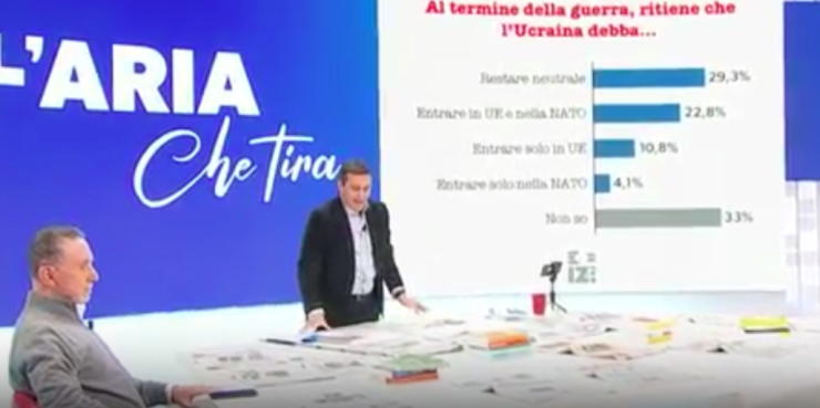 Secondo un sondaggio condotto da Izi, azienda specializzata in analisi e valutazioni economiche e politiche, il 66% degli italiani ritiene che la risoluzione del conflitto bellico debba essere perseguita attraverso una soluzione diplomatica, anche a fronte di potenziali concessioni territoriali da parte dell’Ucraina. Al contrario, il 21% degli intervistati sostiene che l’Ucraina debba continuare a difendersi con determinazione. I risultati di tale indagine sono stati presentati durante la trasmissione “L’Aria che Tira”, condotta da David Parenzo su La 7.