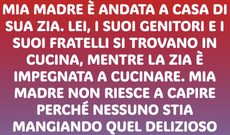 Mia madre era andata a casa di sua zia. Lei, i suoi genitori e i fratelli erano in cucina, mentre la zia cucinava. Non capiva perché nessuno toccasse quel pane delizioso che stava sul tavolo. Era già alla terza fetta quando la zia lasciò la stanza. Suo fratello allora le disse: