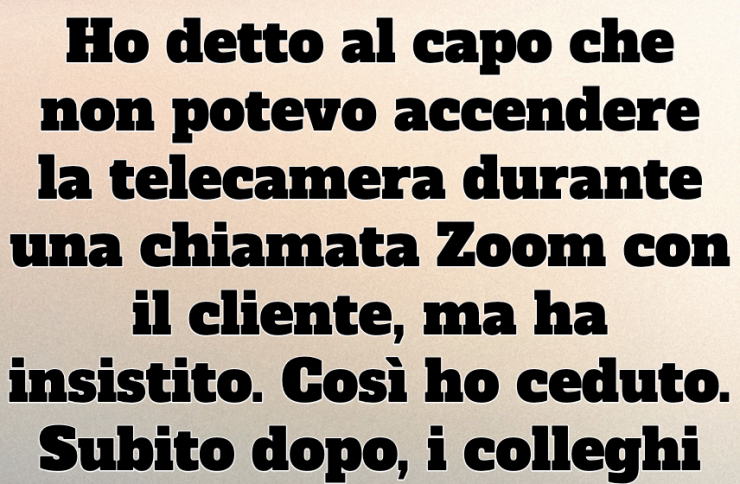 Ho detto al capo che non potevo accendere la telecamera durante una chiamata Zoom con il cliente, ma ha insistito. Così ho obbedito. Immediatamente i colleghi hanno iniziato a ridere, il capo è rimasto a bocca aperta e io ho premuto freneticamente tutti i pulsanti per bloccare lo schermo.