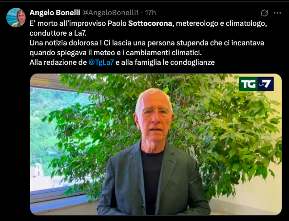 Angelo Bonelli, leader di Alleanza Verdi e Sinistra, ha annunciato su X la scomparsa di Paolo Sottocorona, meteorologo e climatologo noto per la conduzione di programmi su La7. Bonelli ha espresso il suo cordoglio per la perdita di una persona che, secondo lui, “ci incantava quando spiegava il meteo e i cambiamenti climatici”.