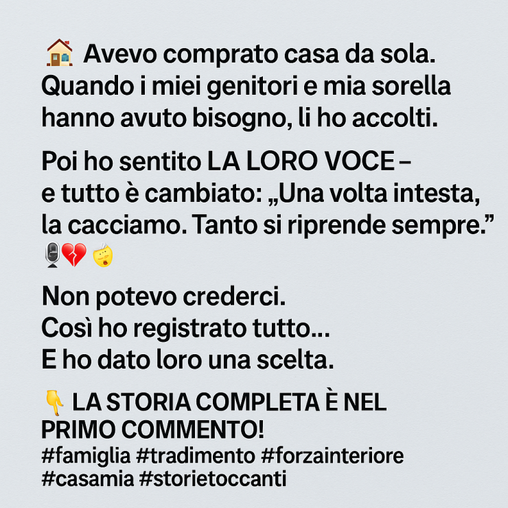 Seduta lì, a pochi metri, sentivo il cuore comprimersi. Avevo rinunciato a tanto per loro. E loro… volevano togliermi anche la casa.