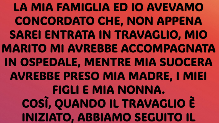 La mia famiglia ed io avevamo concordato un piano preciso: non appena sarei entrata in travaglio, mio marito mi avrebbe accompagnata in ospedale, mentre mia suocera avrebbe preso mia madre, i miei figli e mia nonna.