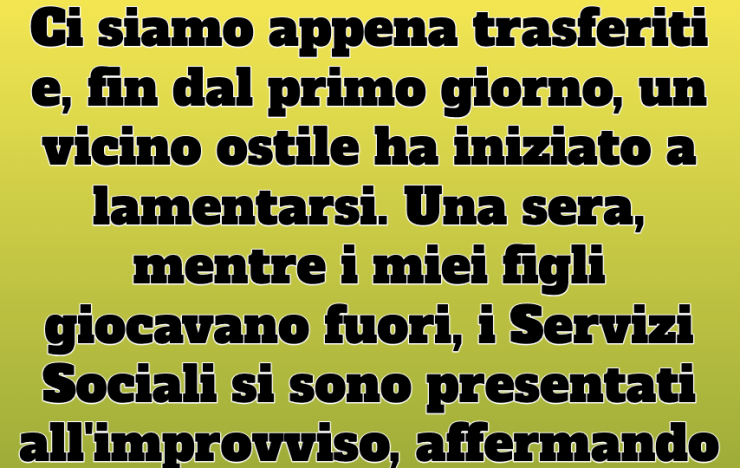 Ci siamo appena trasferiti e, fin dal primo giorno, un vicino ostile ha iniziato a lamentarsi. Una sera, mentre i miei figli giocavano fuori, i Servizi Sociali si sono presentati all’improvviso, affermando di aver ricevuto una segnalazione preoccupante. L’assistente sociale ha chiesto ai miei figli: “Vi sentite al sicuro a casa?”. Con mio shock, hanno risposto: “Sì, certo!”, ma poi l’assistente sociale mi ha guardato con un misto di sospetto e confusione.