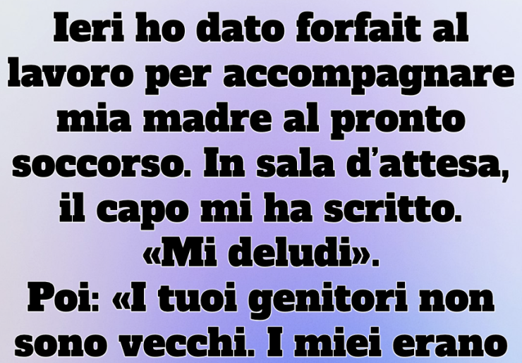 Ieri ho dato forfait al lavoro per accompagnare mia madre al pronto soccorso. Mentre eravamo in sala d’attesa, il mio capo mi ha scritto: «Sono deluso da te». Poi ha rincarato: «I tuoi genitori non sono vecchi. I miei avevano più di ottant’anni e non mi disturbavano, a meno che non ci fosse un’ambulanza». Ho fissato il telefono incredula, poi ho risposto: «Non mi risulta che l’amore abbia un limite di età».