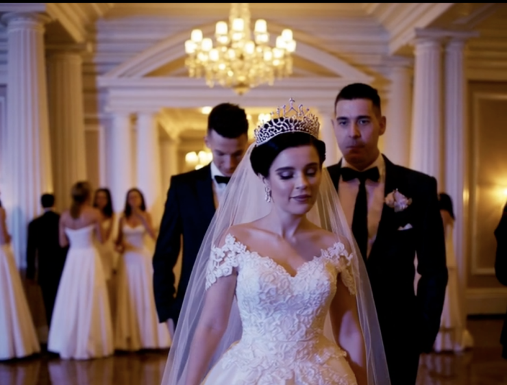 Il giorno del matrimonio arrivammo in una sala piena di donne vestite di bianco. Pochi minuti dopo arrivò Dorothy, raggiante: tiara, strass, e un lungo strascico da cattedrale.