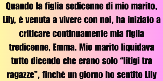 Quando la figlia sedicenne di mio marito, Lily, si è trasferita da noi, ha iniziato subito a criticare mia figlia tredicenne, Emma. Mio marito lo liquidava come “litigi tra ragazze”, fino al giorno in cui ho sentito Lily sussurrare: