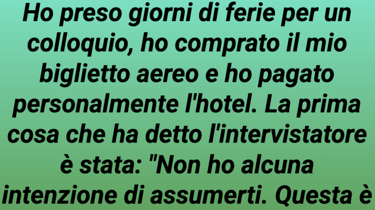 Ho preso giorni di ferie per un colloquio, ho comprato il mio biglietto aereo e ho pagato personalmente l’hotel. La prima cosa che ha detto l’intervistatore è stata: “Non ho alcuna intenzione di assumerti. Questa è solo una cortesia, dato che conosco tuo fratello.” Sono volato a casa dopo otto ore penose.