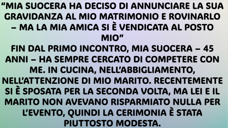 Fin dal primo incontro, mia suocera – 45 anni – ha sempre cercato di competere con me. In cucina, nell’abbigliamento, nell’attenzione di mio marito. Recentemente si è sposata per la seconda volta, ma lei e il marito non avevano risparmiato nulla per l’evento, quindi la cerimonia è stata piuttosto modesta.