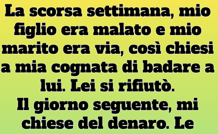 La scorsa settimana, mio figlio era malato, mio marito era fuori città e chiesi a mia cognata di badare a lui. Lei si rifiutò. Il giorno seguente, mi chiese dei soldi. Le ricordai il suo rifiuto e risposi di no. Qualche giorno dopo, appresi qualcosa che cambiò completamente la mia prospettiva. A quanto pare, non era semplicemente egoismo o pigrizia — stava attraversando una difficoltà di cui non avevo la minima idea.