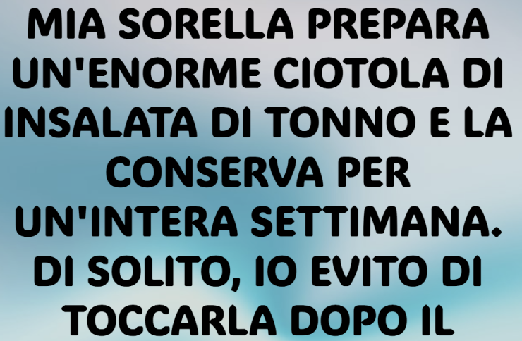 Quando le scrissi dell’insalata di tonno, rispose subito: «Tecnicamente dura 3-5 giorni, ma se ha un odore strano, buttala.» Poi aggiunse: «Stai bene?»