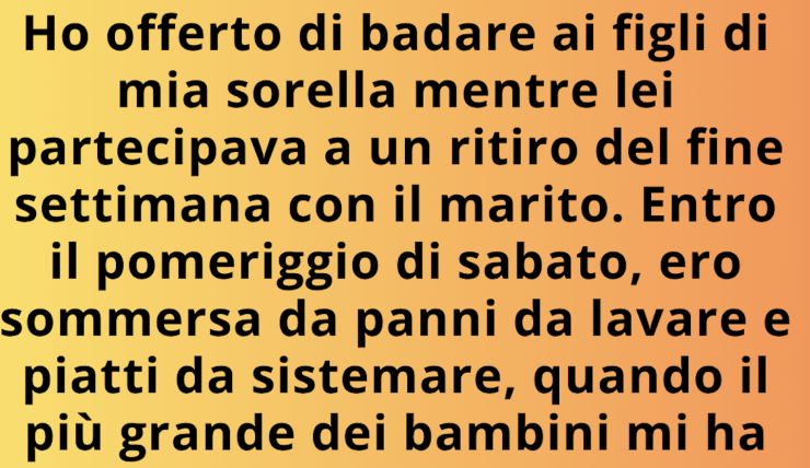 Mi sono offerta di badare ai figli di mia sorella mentre lei partecipava a un ritiro del fine settimana con il marito. Entro il pomeriggio di sabato, ero già sommersa da panni da lavare e piatti da lavare, quando il più grande dei bambini mi ha consegnato un biglietto. Mi si è stretto lo stomaco: era indirizzato a “Mamma”, ma chiaramente era destinato a me. L’ho aperto e sono rimasta senza fiato. Diceva: