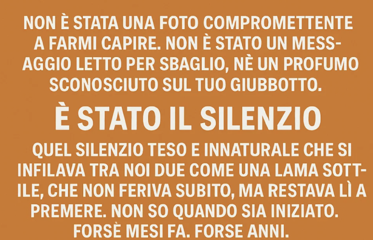Ricordo che quella mattina mi ero svegliata prima di te. La cucina sapeva di caffè e pioggia: una combinazione che di solito mi metteva di buon umore. Ma mentre ti guardavo sorseggiare distrattamente la tua tazza, senza mai alzare gli occhi dal telefono, ho sentito quella fitta. Quella sensazione viscerale che qualcosa fosse cambiato.