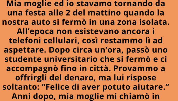Io e mia moglie stavamo tornando da una festa alle due del mattino quando la nostra auto si fermò improvvisamente in una zona remota. All’epoca non esistevano ancora i telefoni cellulari, quindi non ci restava che aspettare. Dopo circa un’ora, passò uno studente universitario e si offrì di accompagnarci in città. Provammo a dargli dei soldi per ringraziarlo, ma lui rispose: “Felice di aiutare.”