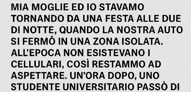 Quando scese per aiutarci a spostare l’auto sul ciglio della strada, vidi che non poteva avere più di vent’anni. Capelli corti, una maglietta semplice, aspetto cordiale ma stanco. Si presentò, ma il nome oggi mi sfugge: per noi, è sempre rimasto “il ragazzo del college che ci salvò quella notte”.