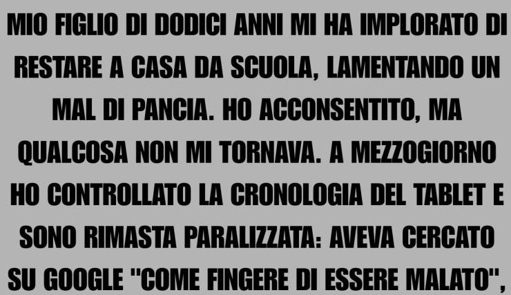 Mio figlio di dodici anni mi ha pregato di lasciarlo a casa da scuola, dicendo di avere mal di stomaco. Ho acconsentito, ma qualcosa non mi convinceva. A mezzogiorno ho controllato la cronologia del suo tablet e sono rimasta gelata: aveva cercato su Google frasi come “come fingere di essere malato”, “come cancellare i messaggi” e “cosa succede se il mio amico muore per una sfida”. Sono corsa nella sua stanza e l’ho trovato raggomitolato sotto le coperte, a fingere di dormire.