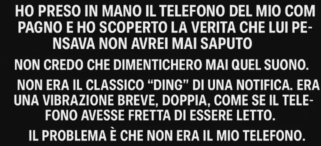 Ero seduta sul divano, avvolta in una coperta, con un bicchiere di vino rosso in mano. Fuori pioveva, e Marco, il mio compagno, era sotto la doccia. Avevo acceso la TV senza guardarla davvero, più per riempire il silenzio che per interesse. Il suo telefono, appoggiato sul tavolo, si illuminò.
