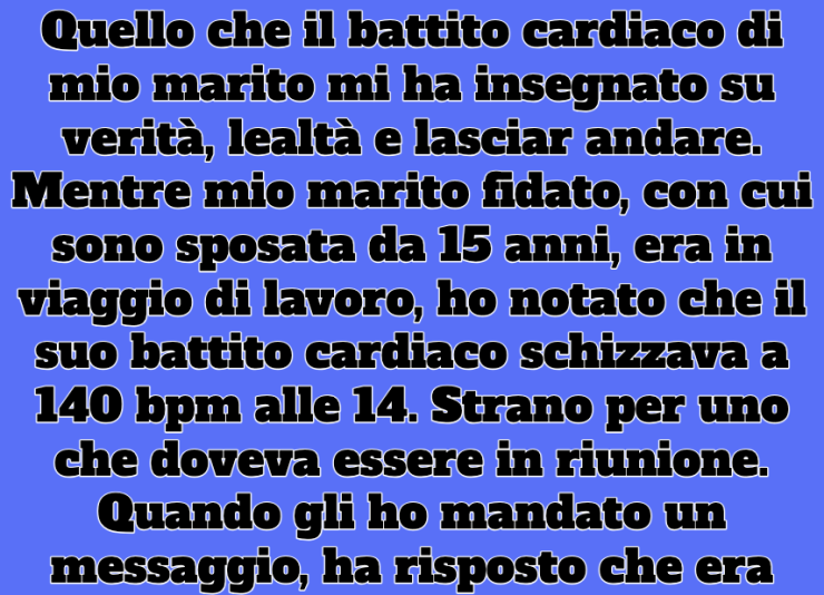 Mentre mio marito fidato, con cui sono sposata da 15 anni, era in viaggio di lavoro, ho notato che il suo battito cardiaco schizzava a 140 bpm alle 14. Strano per uno che doveva essere in riunione. Quando gli ho mandato un messaggio, ha risposto che era una «giornata tranquilla». Quello che non sapeva è che anni fa avevo sincronizzato il suo fitness tracker con la nostra app sanitaria condivisa, quando avevamo iniziato ad allenarci insieme per la nostra prima 5K.
