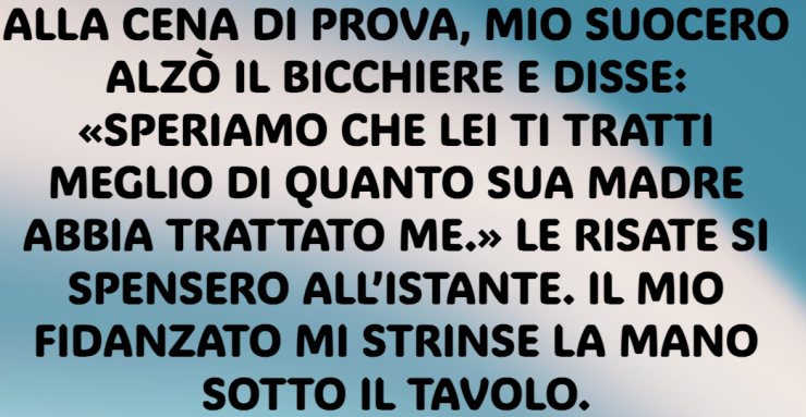 Alla cena di prova, mio suocero alzò il bicchiere e disse: «Speriamo che lei ti tratti meglio di quanto sua madre abbia trattato me.» Le risate si spensero all’istante. Il mio fidanzato mi strinse la mano sotto il tavolo.