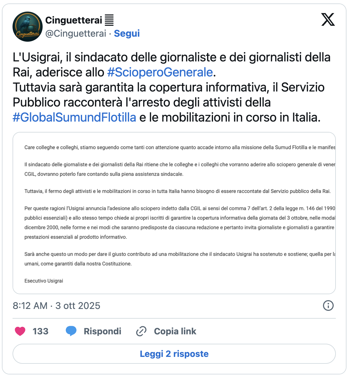 Anche l’Usigrai, il sindacato dei giornalisti Rai, ha aderito allo sciopero, garantendo però la copertura informativa della giornata e delle manifestazioni in corso nelle principali città italiane.