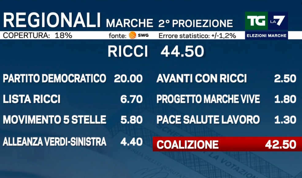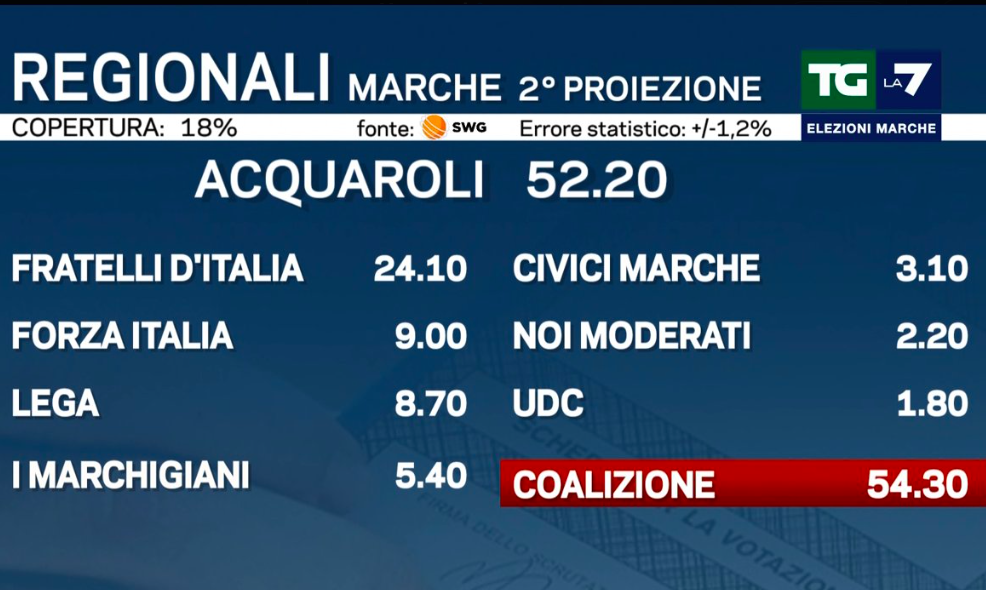 La seconda proiezione fornita da La7 ha confermato il predominio del centrodestra, che si attesta al 54,30%, mentre il centrosinistra si ferma al 42,50%. La copertura di questo dato è stata del 18%. Questi risultati evidenziano una netta preferenza degli elettori per la coalizione di Fratelli d’Italia, che si posiziona come primo partito con il 24,10%, superando il Partito Democratico, fermo al 20%.