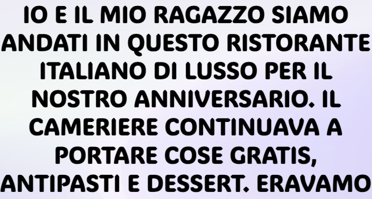 Io e il mio ragazzo siamo andati in un ristorante italiano di lusso per il nostro anniversario. Il cameriere continuava a portare fuori cose gratis, antipasti e dolci. Eravamo confusi ma non ci siamo lamentati. Solo quando ci siamo resi conto che il cameriere ci aveva scambiati per qualcun altro.
