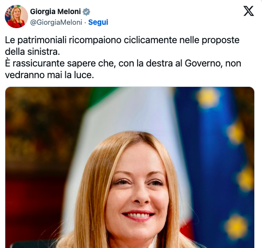 Tuttavia, il governo attuale, guidato dalla premier Giorgia Meloni, si oppone fermamente a queste richieste. La Meloni ha rassicurato i cittadini su X, affermando: “Le patrimoniali ricompaiono ciclicamente nelle proposte della sinistra. È rassicurante sapere che, con la destra al Governo, non vedranno mai la luce”. Questa posizione riflette la volontà del governo di mantenere una linea fiscale che non preveda nuove tasse sui patrimoni, in un contesto già caratterizzato da una pressione fiscale elevata.