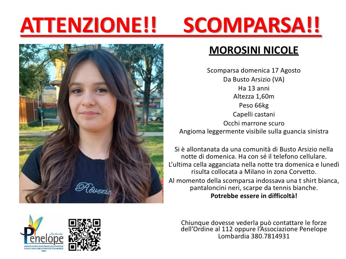 Una giovane di soli 13 anni, Nicole Morosini, è stata dichiarata scomparsa nella serata di domenica 17 agosto. La ragazza, originaria di Busto Arsizio, in provincia di Varese, si sarebbe allontanata volontariamente dalla comunità in cui era ospitata. La madre ha diffuso un appello tramite un post su Facebook, chiedendo aiuto per ritrovarla e invitando chiunque avesse informazioni a contattare le autorità o l’associazione Penelope Lombardia, che si sta occupando del caso.