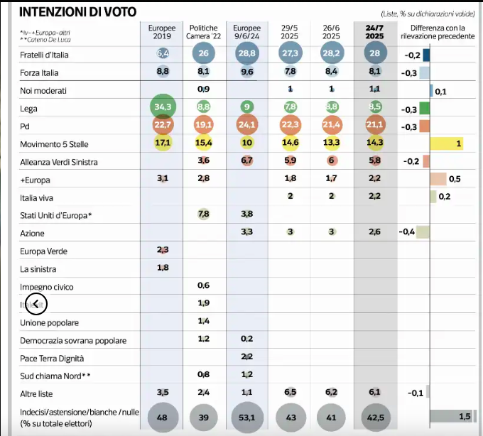 Noi Moderati risulta stabile all’1,1 % (fase giugno‑luglio).